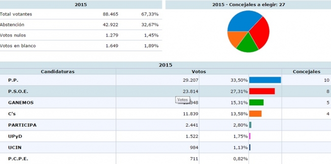 El PP logró 29.351 votos, el 33,48% de los votos. El PSOE sumó 23.944, el 27,31%. Ganemos sumó 13.446 votos, el 15,34%. Ciudadanos 11.902 votos, el 13,58 % de los votos.