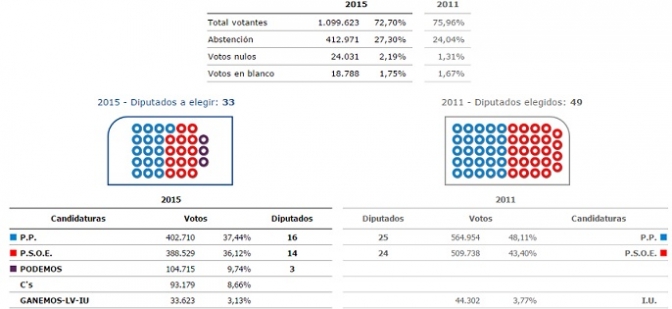 En un Parlamento autonómico de 33 diputados, con el 99,34 % escrutado, el PP ha conseguido 16 representantes y el 37,51 % de los votos, el PSOE 14 (36,11 %) y Podemos 3 (9,73 %).