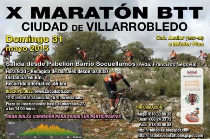 El próximo domingo, día 31 de mayo, la ciudad acogerá la celebración de la X Maratón BTT “Ciudad de Villarrobledo”, organizado por el Club Ciclista Roble-Bike, en colaboración con el Ayuntamiento de Villarrobledo y la Diputación de Albacete.