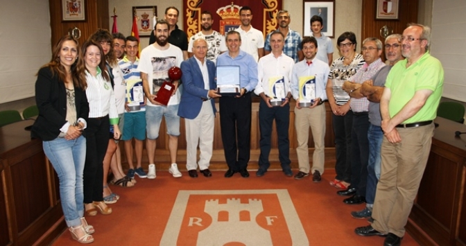 Jugadores, cuerpo técnico y directivos fueron recibidos por el alcalde de La Roda, Vicente Aroca, y el concejal de Deportes, Eduardo Sánchez, junto a otros miembros de la corporación municipal.