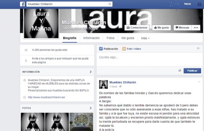 Las familias Morate y Garcés han colgado en la página de Facebook de su empresa de muebles un texto dirigiendo unas palabras a Sergio, a los padres de Marina y Laura, a la policía y a los periodistas.