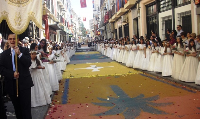 La procesión, con la Custodia, que parte a las 11 de la mañana de la Parroquia de Nuestra Señora de la Asunción inicia el recorrido por esas calles adornadas y coloreadas. Este año el fuerte viento a primeras horas del domingo, han deslucido el trabajo ya hecho, desdibujando la labor de estos colectivos. A pesar de ello el discurrir de la Custodia, en una mañana soleada, le ha dado belleza y vistosidad a las calles por las que trascurre el cortejo procesional con los niños y niñas vestidas de primera comunión.