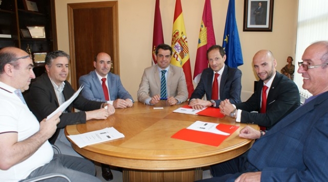 El alcalde de Albacete ha firmado el préstamo con Santos Sanz Oleo, director territorial del Banco Santander en Castilla-La Mancha, en presencia de Carlos Macho, director de Oficina de Empresas de la entidad financiera en Albacete, y Rubén Alejandro Marco, responsable territorial de Instituciones del Banco, así como del concejal de Obras Públicas e Infraestructuras, Julián Garijo.