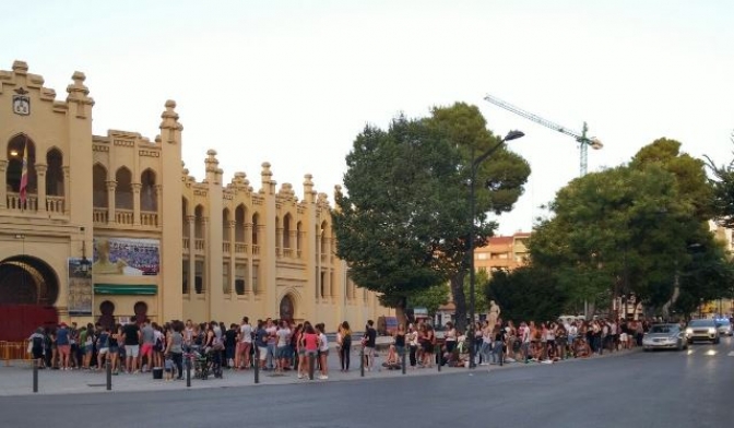 La imagen muestra cómo estaba la puerta de la plaza de toros cuando todavía quedaban muchas horas para que se abrieran las puertas y comenzara el concierto. Los y las seguidoras de Estopa no querían perderse nada del concierto y querían estar cerca, de ahí las importantes colas el sábado por la tarde, pero también había gente muchas horas antes.