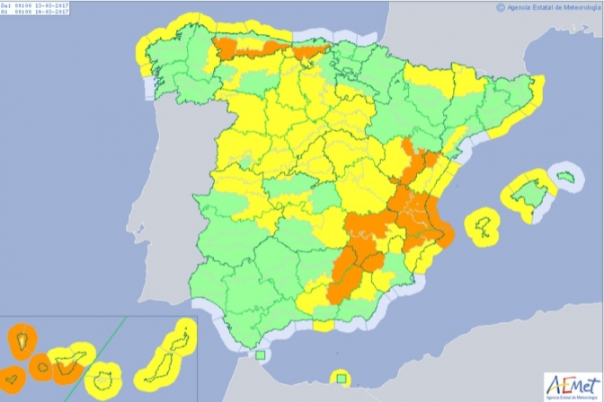 Las acumulaciones más importantes de precipitación tendrán lugar el lunes en la Comunidad Valenciana, extremo oriental de Castilla-La Mancha y Murcia; y, en particular, en la provincia de Valencia y norte de Alicante, donde probablemente se superarán los 140 litros por metro cuadrado.