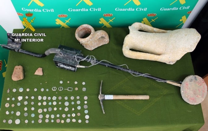 Entre el material decomisado se encuentran cuatro aparatos detectores de metales, así como otras pequeñas herramientas como azadas, empleadas para la extracción de las piezas.