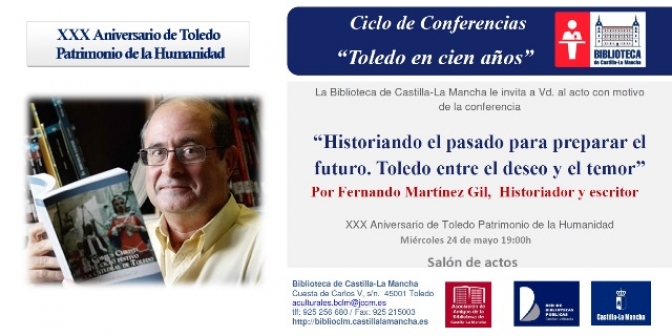 La primera conferencia, a cargo del historiador y escritor Fernando Martínez Gil llevará el título de  “Historiando el pasado para preparar el futuro. Toledo entre el deseo y el temor”.  Esta primera conferencia del ciclo utilizará la perspectiva de la historia y del historiador, no entendidos, sin embargo, como sujetos relegados al pasado, sino interesados en su conocimiento para poder mejor actuar sobre el presente y propiciar el cambio deseado. Se analizará la historia reciente de la ciudad de Toledo en su evolución a partir de 1975 para que pueda servir de balance y base de discusión a las posteriores intervenciones centradas en el futuro que vendrá. Dicha evolución, vivida y en la memoria de las últimas generaciones de toledanos, ha contado con jalones positivos, como puedan ser la capitalidad regional o la declaración de patrimonio mundial, pero también derivas preocupantes, como los problemas medioambientales, la despoblación del casco histórico o su excesiva terciarización, más dirigida a la satisfacción de las necesidades de un turismo masivo que a las del ciudadano. Efectuado el balance histórico, se intentarán plantear algunas propuestas de futuro, en las cuales es muy importante la innovación y algunas transformaciones radicales, pero también tener muy claro lo que es necesario conservar y, aún más, lo que se ha perdido y es deseable recuperar. El conocimiento de la historia resultará, en este sentido, crucial para afrontar con éxito el futuro de la ciudad.