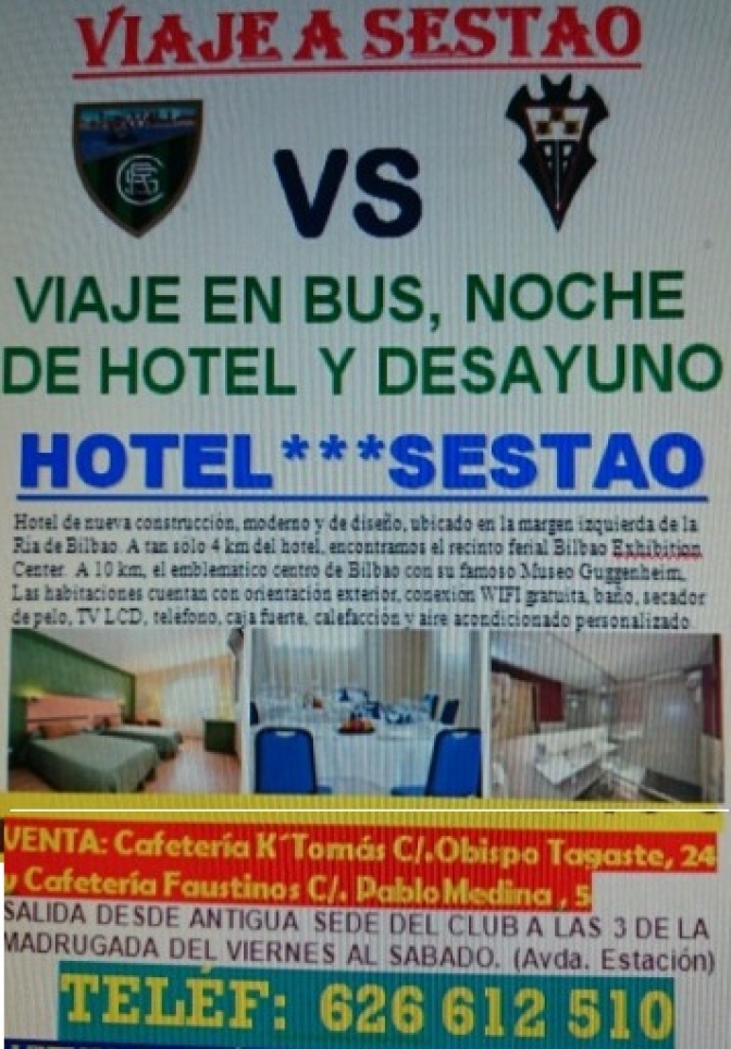 Una de las opciones más apetecibles probablemente es el viaje que organizan las cafeteraís K’Tomas (Obispo Tagaste, 24) y Faustinos (Pablo Pedina, 5). Organizan un viaje en autobús, con noche de hotel, desayuno, bocadillo y entrada para el partido de Sestao. El precio es de 73 euros. El hotel es de tres estrellas y está en la margen izquierda de la ría de Bilbao, en Sestao. Las entradas se compran en las cafeterías mencionadas y para más información hay que llamar al 626612510.