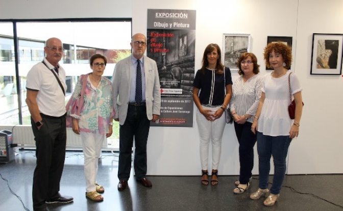 a la inauguración de la exposición a beneficio de Cruz Roja compuesta por las obras de los alumnos de las escuelas de pintura de los barrios Cañicas-Imaginalia y los Llanos del Águila, que ha tenido lugar en la Casa de la Cultura José Saramago.