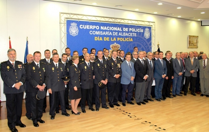 Durante el acto, en el que se ha estrenado el himno de la Policía Nacional, Manuel Serrano ha estado acompañado por el comisario jefe provincial del Cuerpo Nacional de Policía de Albacete, José Francisco Roldán, el subdelegado del Gobierno en Albacete, Aquilino Iniesta, el fiscal superior de Castilla-La Mancha, José Martínez, y el presidente de la Diputación, Santiago Cabañero.