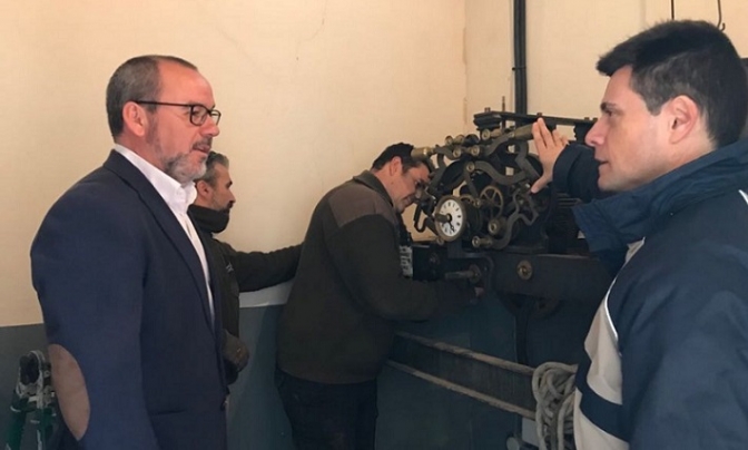 Desmontaje para iniciar los trabajos de limpieza, pulido, arreglo y engrase, para una vez restaurado, ubicarlo en el Claustro del Ayuntamiento, para que el público pueda contemplar su maquinaria.