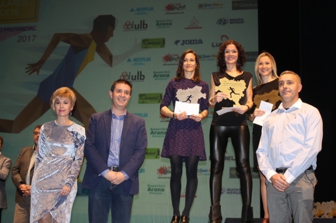 Entrega de trofeos. Tras las intervenciones y la emisión de un emotivo vídeo en reconocimiento a las dos carreras mejor valoradas por los participantes, Madrigueras y La Roda, las autoridades procedieron a la entrega de trofeos en las distintas categorías; siendo las ganadoras en féminas Laura Villar, Isabel Belmonte, Andrea Iniesta, Sandra Ruiz, Otilia Martínez, Ana María Jiménez, Ana López, María Antonia Gómez y Carmen Ruiz.