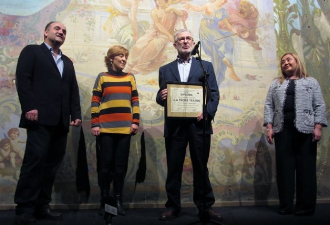 Amparo Torres presentó el acto recordando la trayectoria de La Troya en estos 40 años, en los que cientos de villarrobledenses desde distintas facetas han venido colaborando con el grupo, y agradeció a Segundo Belmonte haber dado la oportunidad a esta ciudad de compartir con él su sueño teatral.