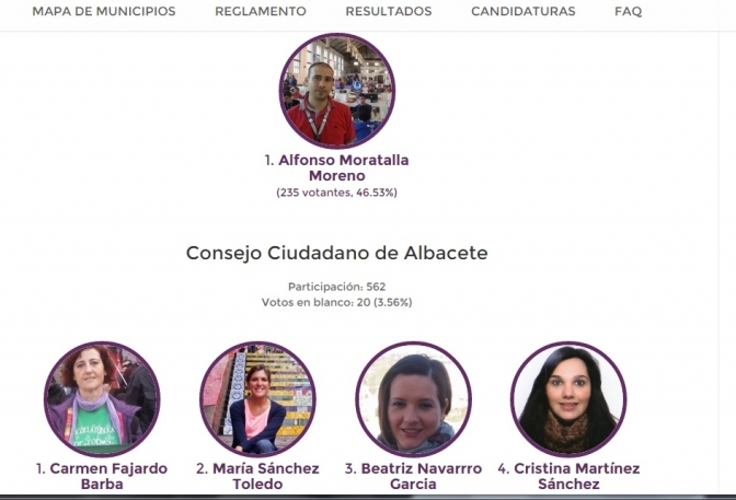 En Albacete, de los 562 votos de los 1078 inscripciones, la mayoría fueron para Alfonso Moratalla Moreno, que sumó 235, el 46,53 %. Al Consejo Ciudadano de Albacete los miembros más votados fueron: Carmen Fajardo y María Sánchez, ambas por encima del 50% de votos; tras ellas: Beatriz Navarro, Cristina Martínez, Antonio García Padilla, Llanos Rabadán, María José Aguilar, Eduardo Siquier, Mar Defez, Maribel Cebrián, José Ramón Rodríguez, Sergio León, Ricardo Monsalve, Tomasa Córcoles, Luis Ángel Aguilar, Diana Rosa Francisco, Javier Armero, Gonzalo J. Martínez, Javier González y Alejandro Calero.