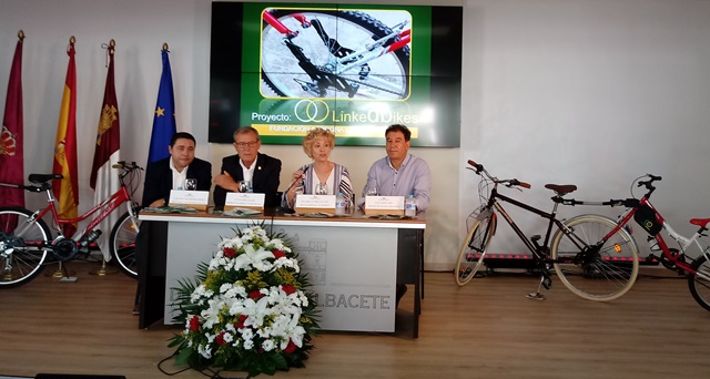 La Diputada de Deportes, María Victoria Leal, ha sido la encargada de dar a conocer, Linked Bikes, un novedoso sistema que permite unir dos bicicletas sin realizar ningún tipo de reforma o modificación en la estructura de las mismas. El acto, al que también han asistido, Lucio Gómez, presidente de ASPRONA y ASLA, Francisco Martínez, director de ASLA, y Blas García, creador del proyecto, se ha celebrado en el pabellón de la Diputación Provincial en el Recinto Ferial.