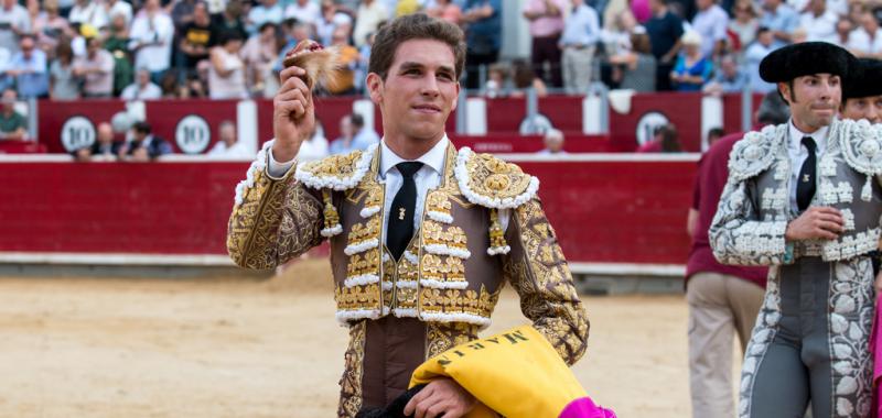 Ginés Marín, de tabaco y oro: estocada (oreja); y pinchazo hondo y casi entera (silencio).