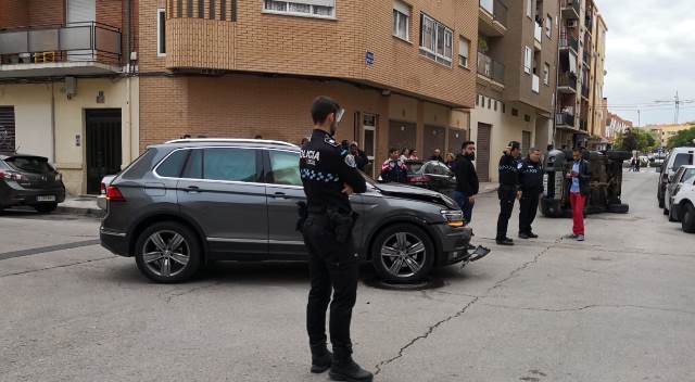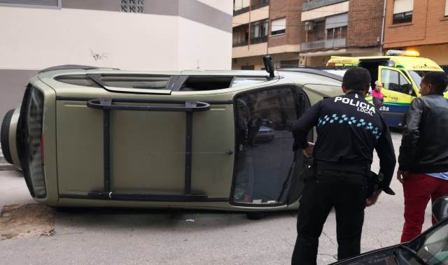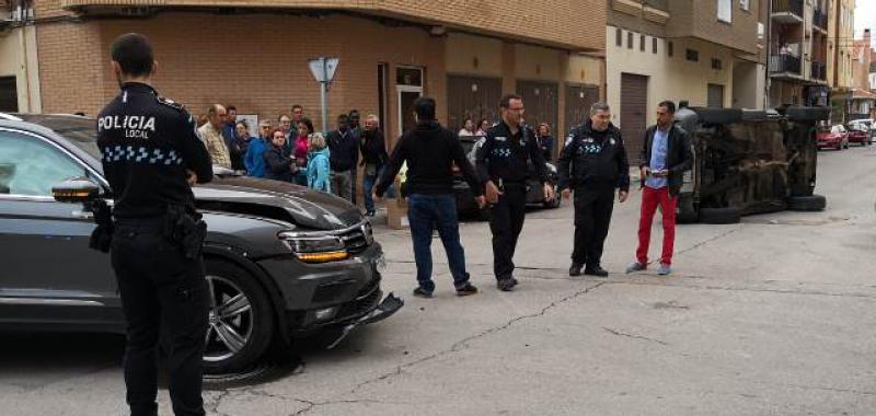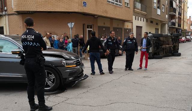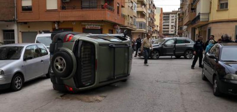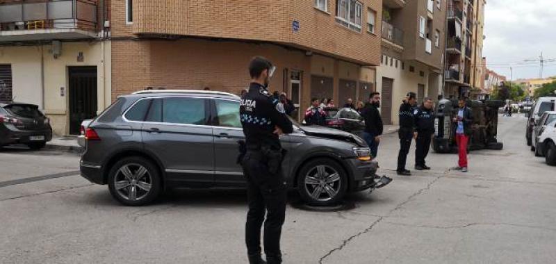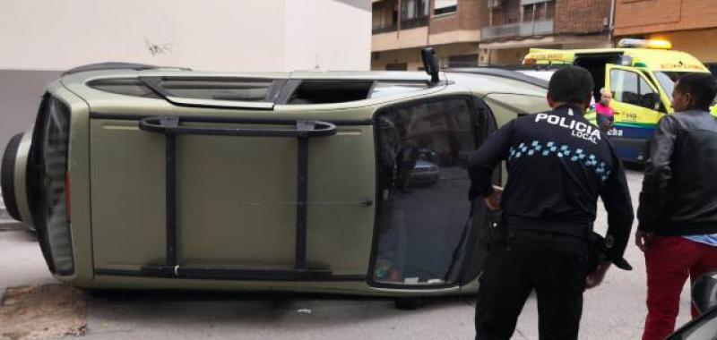 Un herido tras un espectacular choque con un coche que acabó volcado en la calle Lepanto de Albacete