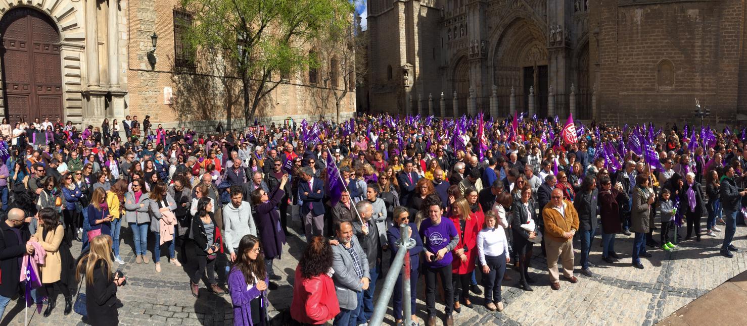 En Toledo, la plaza del Ayuntamiento unas 400 personas se han sumado a la concentración convocada por de las organizaciones sindicales CCOO y UGT junto a la Plataforma 8M, y entre los participantes se han encontrado autoridades y el colectivo estudiantil.