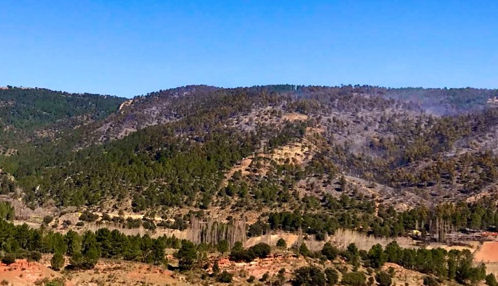 Todavía no se ha dado a conocer la superficie afectada por el fuego en esta zona de la Sierra del Segura, que se corresponde en su mayor parte a pinares, y que se originó por una quema descontrolada de rastrojos que se extendió por el monte.