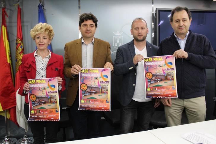 El concejal de deportes en el Ayuntamiento de Albacete, Francisco Navarro junto a la diputada provincial de deportes, Mª Victoria Leal, el presidente de la Federación de Baloncesto de Castilla La Mancha, Jose Esteban Gálvez y el presidente del UCA de baloncesto, Juan Carlos Martinez han presentado el trofeo de la Fase Final de la primera división femenina de baloncesto entre Castilla La Mancha y Extremadura.