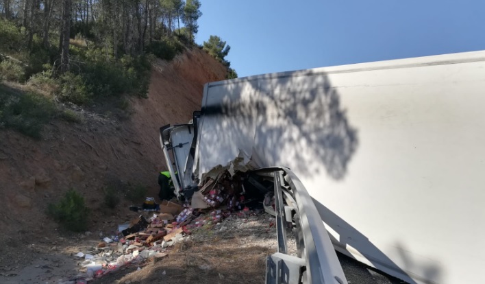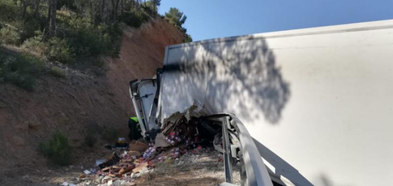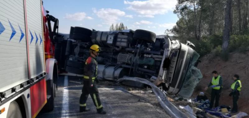 Los bomberos de Motilla del Palancar (Cuenca) han sido los encargados de desencarcelar a las dos personas que habían quedado atrapadas en el camión.