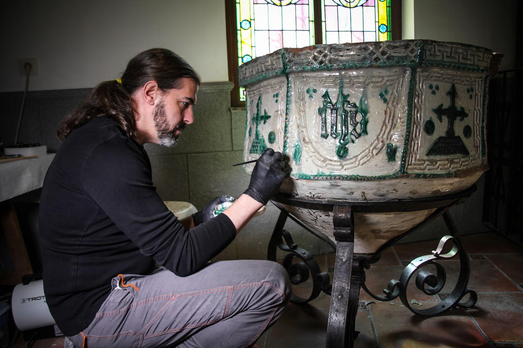 La estructura y composición de la Pila Bautismal está realizada en cerámica cocida y asentada sobre un soporte de forja, formado por un arco circular por tres patas. Dicho soporte sustituye al original, que fue primitivamente de cerámica vidriada o de piedra. La restauración de la pieza, compleja por su fisionomía, ha sido realizada por la empresa ECRA Restauración de Arte.