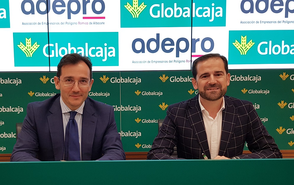 Javier González, director territorial de Globalcaja en la provincia de Albacete, y Pedro Jesús Sáez, presidente de la Asociación de Empresarios del Polígono Romica de Albacete (ADEPRO), han suscrito un convenio de colaboración.