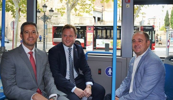 El alcalde de Albacete, Vicente Casañ; junto al vicealcalde de la ciudad, Emilio Sáez; el concejal de Movilidad, José González; y representantes de Vectalia, la empresa concesionaria del Servicio de Transporte Urbano, han asistido a la presentación de los trabajos de mejora y adecuación que se han efectuado en 20 de los vehículos de la flota de autobuses y que han supuesto una inversión de medio millón de euros.