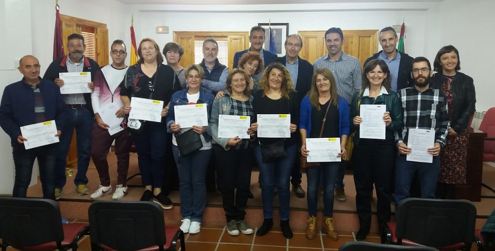 El delegado provincial de Economía, Empresas y Empleo, Nicolás Merino ha entregado junto al alcalde de Liétor, Antonio García Docon, los certificados de profesionalidad a los 8 alumnos que han participado, en los últimos seis meses, en el Programa de Recualificación y Reciclaje Profesional (Recual), “Liétor Rehabilita”, especializado en Operaciones Auxiliares de Acabados Rígidos y Urbanización.