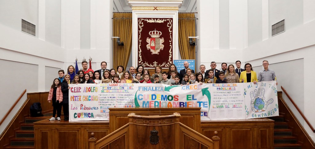 El Salón de Plenos de las Cortes de Castilla-La Mancha se ha llenado con 120 escolares de cinco centros educativos de la región: Nuestra Señora del Carmen de Villarrobledo (Albacete), Manuel Clemente del Moral de Calatrava (Ciudad Real), Adolfo Martínez Chicano de Las Pedroñeras (Cuenca), el CRA de Pastrana (Guadalajara) y San Patricio de Toledo. “Sois los mejores diputados y las mejores diputadas posibles”, les ha dicho Bellido en su recibimiento, a la par que les ha designado representantes del casi medio millón de menores de 18 años de la región y “de todos los niños y niñas del mundo”.