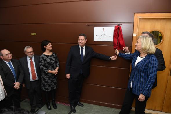 Al término del homenaje se ha descubierto una placa que recordará al exprofesor y exministro Alfredo Pérez Rubalcaba en el Aula Magna del Campus de la UCLM en Ciudad Real.