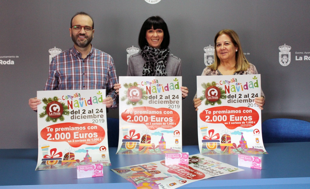 La concejala de Comercio, María José Fernández, junto a la presidenta de la Asociación de Comerciantes de La Roda, María González, y el secretario de la misma, Isidro Pastor, presentaron en rueda de prensa la tradicional campaña de Navidad que se desarrolla desde el pasado día 2 y hasta el 24 de diciembre y que sorteará 2.000 euros en premios.