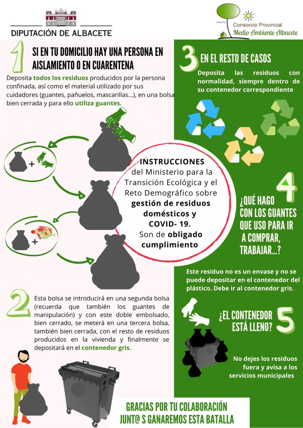 La Diputación Provincial de Albacete, en su objetivo de contribuir al frente común que el conjunto de la sociedad está llevando a cabo para frenar la curva de contagios ocasionada por el COVID-19, ha dado traslado a los 87 municipios de la provincia de las recomendaciones básicas que se deben seguir a la hora de gestionar de manera correcta los residuos que se generan en los domicilios (tanto por parte de personas enfermas o en cuarentena, como por aquellas que gozan de buen estado de salud), durante el Estado de Alarma decretado por el Gobierno Central para hacer frente a la emergencia sanitaria en la que se ha visto inmerso el país con motivo de la crisis del Coronavirus COVID-19.