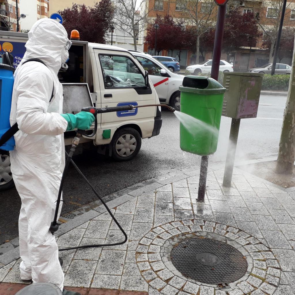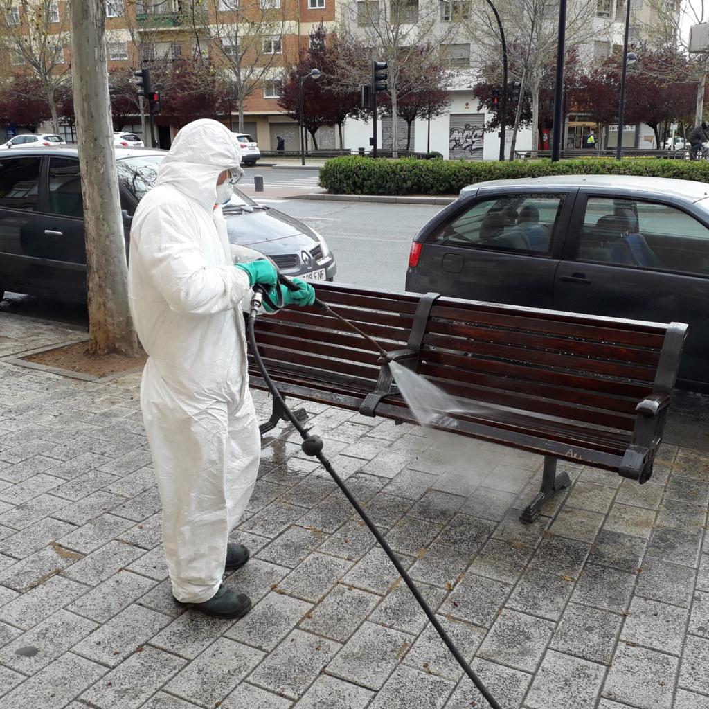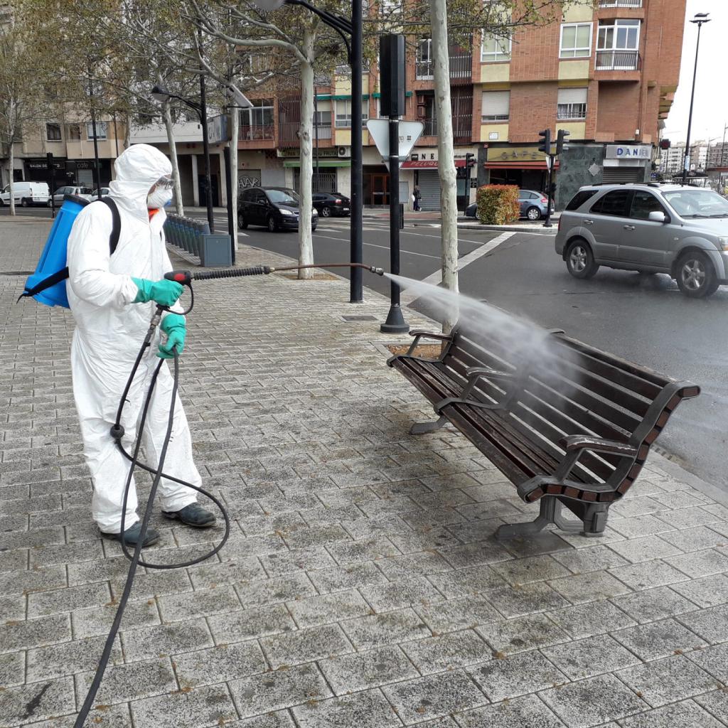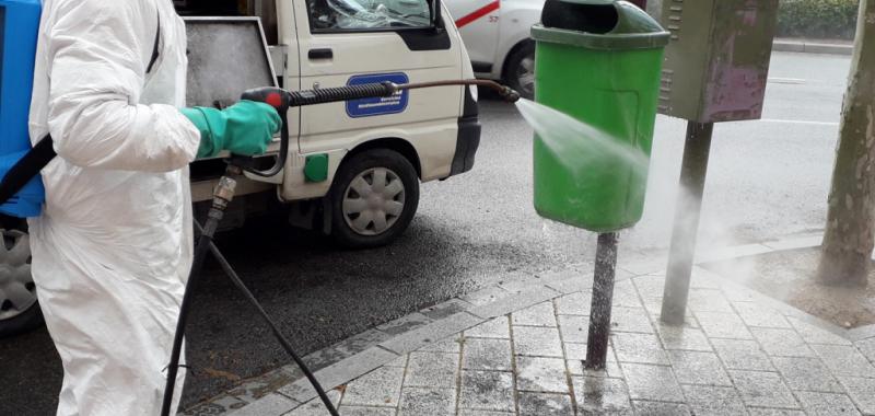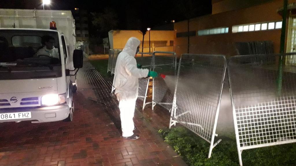 Los equipos de limpieza y desinfección de la ciudad prosiguen con su labor, de tal forma que se procede a la desinfección de todos los elementos de mobiliario urbano susceptibles de transmitir el virus porque son tocados habitualmente por los vecinos, tales como barandillas, bancos o papeleras, y también actúan sobre las entradas a establecimientos con afluencia de personas.