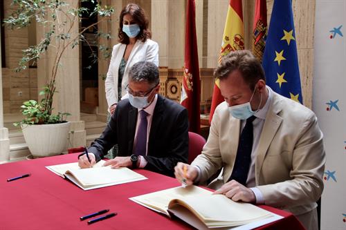 El alcalde de Albacete, Vicente Casañ, el director territorial de CaixaBank en la Zona Centro, Rafael Herrador, y la directora general de MicroBank, Cristina González, han firmado un convenio de colaboración para facilitar la financiación de proyectos empresariales