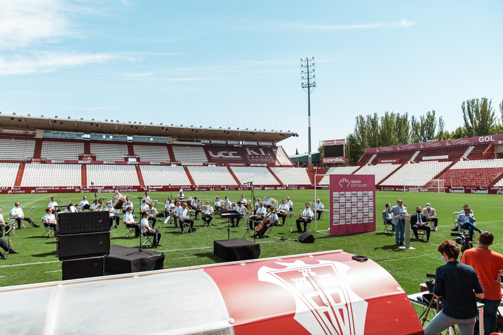 La Banda Sinfónica Municipal de Albacete ha acompañado al cantante Casimiro Ortega, creador del himno del Albacete Balompié, poniendo ambos la nota musical en ese sentido y profundo homenaje.