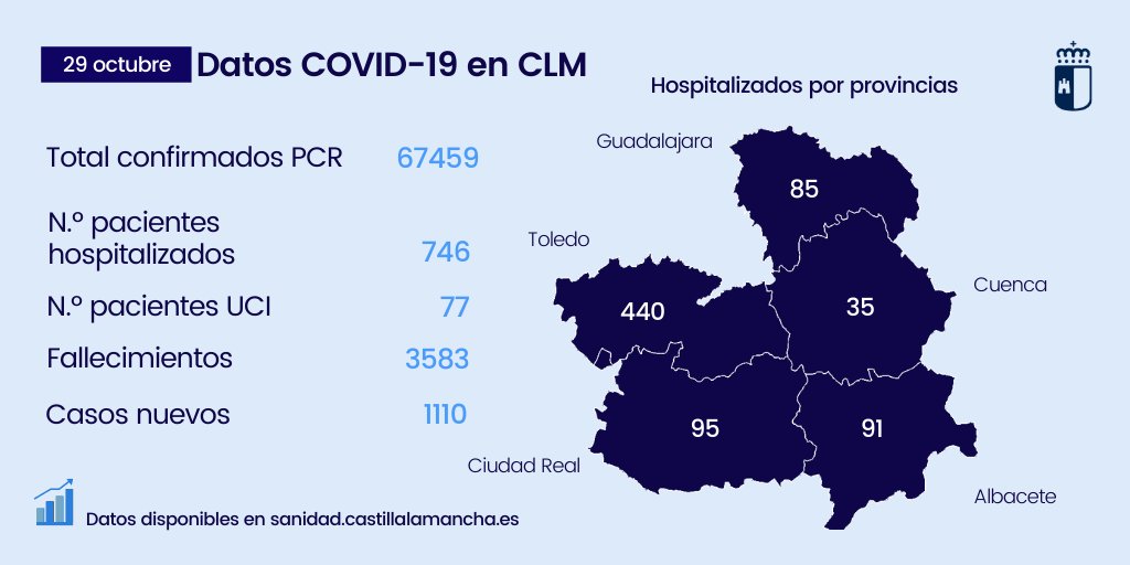 En las últimas 24 horas se han registrado 20 fallecidos por COVID-19, 12 en la provincia de Toledo, 4 en Guadalajara, 2 en Albacete, 1 en Cuenca y 1 en Ciudad Real.