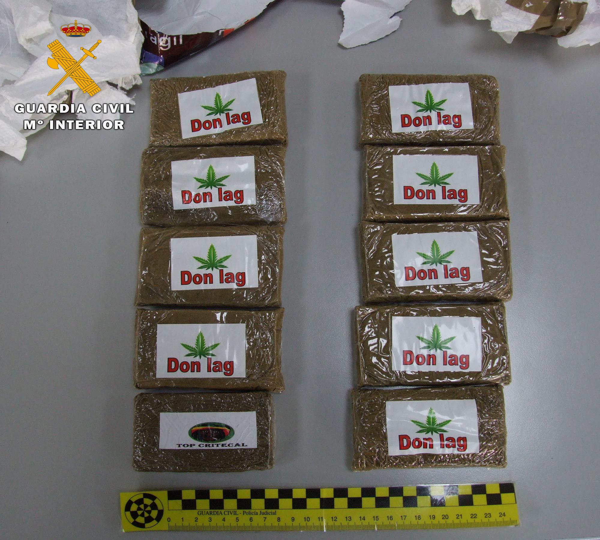 A raíz de esta información la Benemérita montó un dispositivo policial que consiguió identificar al destinatario e interceptar el paquete sospechoso que acababa de recoger. Tras su apertura, se localizaron en su interior 10 paquetes perfectamente precintados y embalados que contenían 1.000 gramos de una sustancia estupefaciente de color marrón, que tras ser sometida a un narcotest dio positiva a hachís.