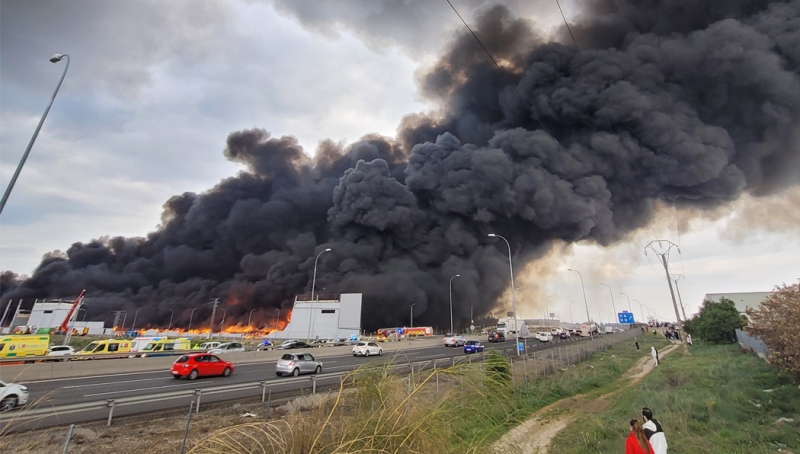 La alcaldesa de Seseña, Silvia Fernández, ha pedido a la población que cierre las ventanas y no salga a la calle por la gran nube de humo causada por el incendio de una nave industrial este martes en Seseña Nuevo.