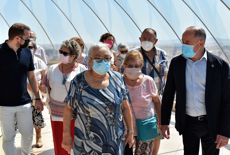 El alcalde, Emilio Sáez, durante la visita que ha cursado junto a un grupo de personas mayores, usuarias del servicio de promoción de la autonomía del Ayuntamiento de Albacete, al mirador de los Depósitos de la Fiesta del Árbol, se ha referido a la importancia de poner en práctica este tipo de colaboraciones y acompañamientos “a nuestros mayores, que han conseguido poner en pie esta ciudad, y con quienes tenemos la deferencia de ofrecerles una visita especial a las tan ansiadas vistas de la ciudad desde este mirador”.