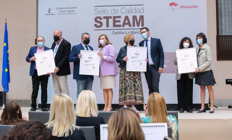 La consejera de Educación, Cultura y Deportes, Rosa Ana Rodríguez, ha hecho entrega hoy a 46 centros educativos que desarrollan proyectos STEAM en Castilla-La Mancha de un sello de calidad para premiar el esfuerzo que han realizado para introducir de la mejor manera posible las ciencias, la tecnología, ingeniería, el arte y las matemáticas (Science, Technology, Engineerin, Art, Mahematics) en cada una de las aulas y por conectar con todo el alumnado.
