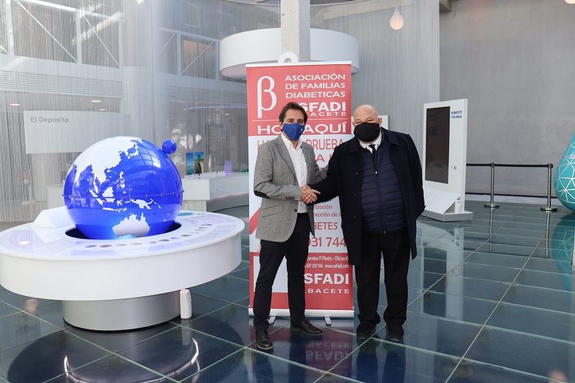 La firma del convenio de colaboración entre el director-gerente de Aguas de Albacete, Pepe Belda, y el presidente de Asfadi, Deogracias Martínez, ha tenido lugar en el Centro de Interpretación del Agua, junto al planeta azul que nos recuerda que el agua es un bien escaso y hay que cuidarlo. Este y otros mensajes sobre la importancia de un uso responsable y eficiente del agua son los que Pepe Belda ha trasladado a la Junta Directiva de Asfadi en la visita guiada que ha tenido lugar antes de la firma del convenio de colaboración.