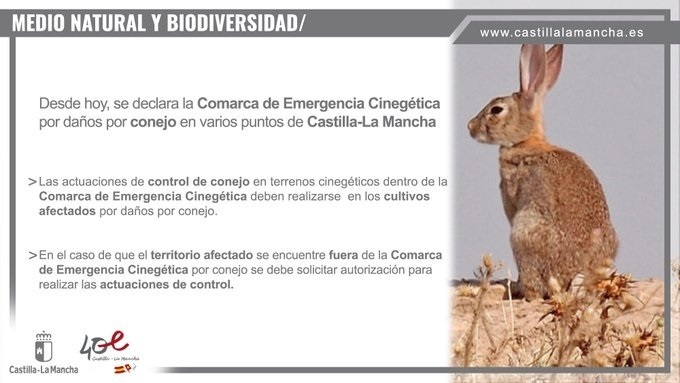 Esta nueva declaración de 'Comarca de Emergencia Cinegética Temporal por daños causados por el conejo' incluye 279 municipios de la región (47 en Albacete, 29 en Ciudad Real, 81 en Cuenca, 23 en Guadalajara y 100 en Toledo).