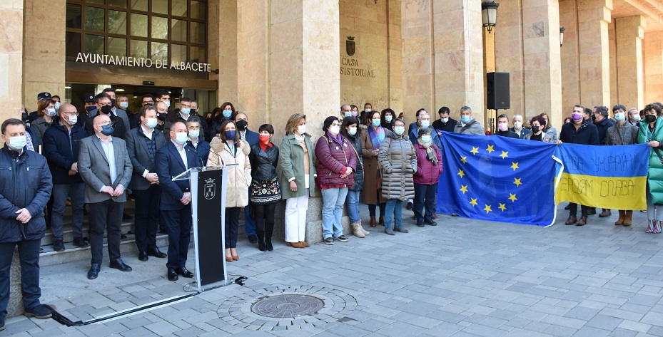 El Ayuntamiento de Albacete ha trasladado su solidaridad con el pueblo ucraniano, guardando cinco minutos de silencio a las puertas de la Casa Consistorial, sumándose a la convocatoria realizada por la Federación Española de Municipios y Provincias (FEMP).