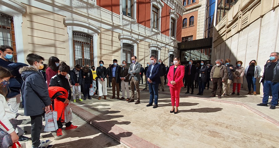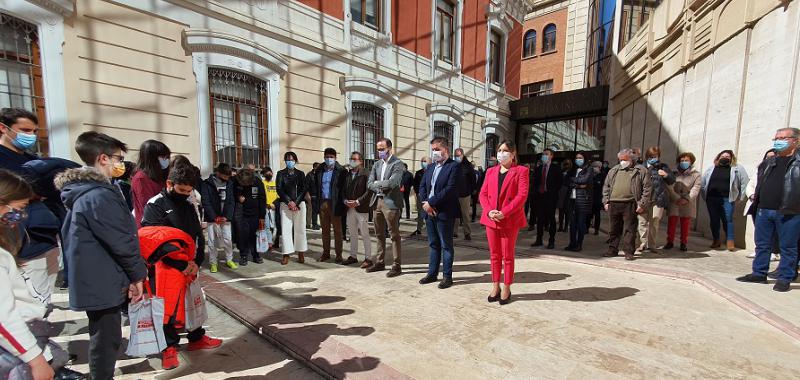 Alcaldes, alcaldesas, ediles de distintas localidades, alumnado del colegio Diego Velázquez de Albacete y representantes de todos los Grupos de la Corporación, con el presidente Santi Cabañero al frente, se han sumado, a las puertas de la Diputación, a la concentración silenciosa que la Federación Española de Municipios y Provincias (FEMP) había convocado para las 12:00 horas de este 9 de marzo, en solidaridad con el pueblo de Ucrania ante la invasión de la Federación Rusa.
