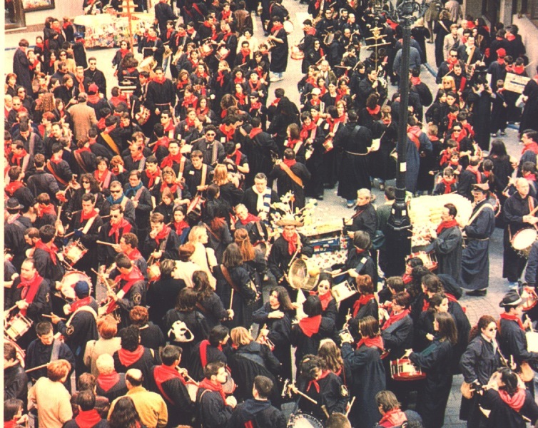 Cuando esa melodía termine, empezará a contar el minuto de silencio de los tambores, a cuyo fin la banda entonará el toque de tambor Racataplá laureado --acompañado por cornetas--, al que ya podrán volver a unirse los miles de tambores que se dan cita en el casco antiguo de la ciudad cada Miércoles Santo, en la primera de las tamboradas en las que los tamborileros salen a la calle ataviados con su túnica, pañuelo y tambor.