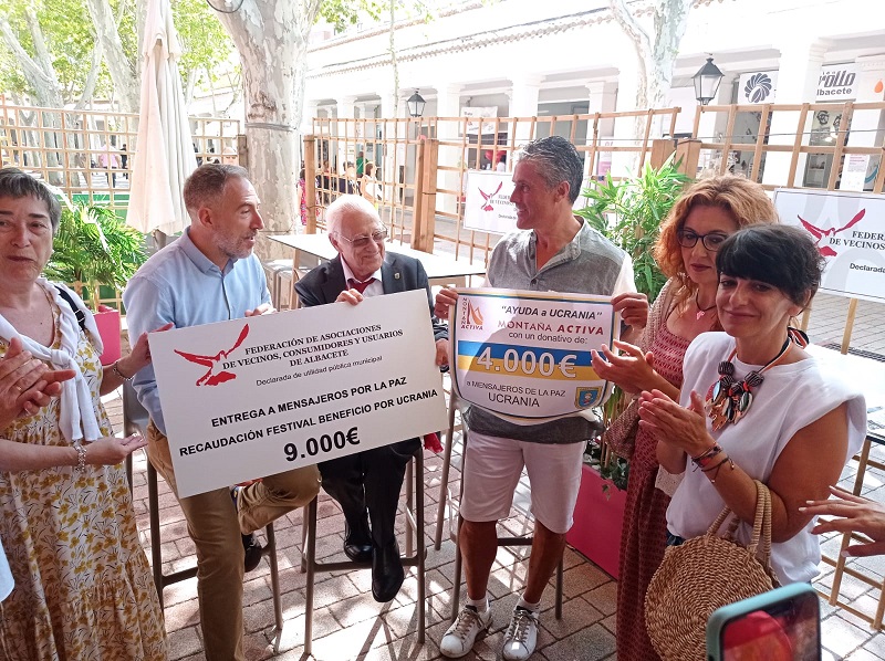 El stand de la Federación de Asociaciones de Vecinos de Albacete (FAVA) en el Recinto Ferial ha sido el escenario elegido para hacer entrega a la Fundación Mensajeros de la Paz de un cheque de 9.000 euros, cantidad que se recaudó en la jornada de convivencia ‘Albacete con Ucrania’, gracias a la solidaridad de la ciudadanía de Albacete y la implicación de las asociaciones vecinales de la ciudad.