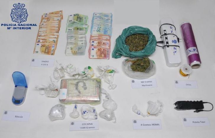 En total, la Policía Nacional ha decomisado 1.648 gramos brutos de cocaína y 190 gramos de marihuana, 11.575 euros en efectivo, útiles para el procesamiento y envasado de la droga, un vehículo y una pistola táser.