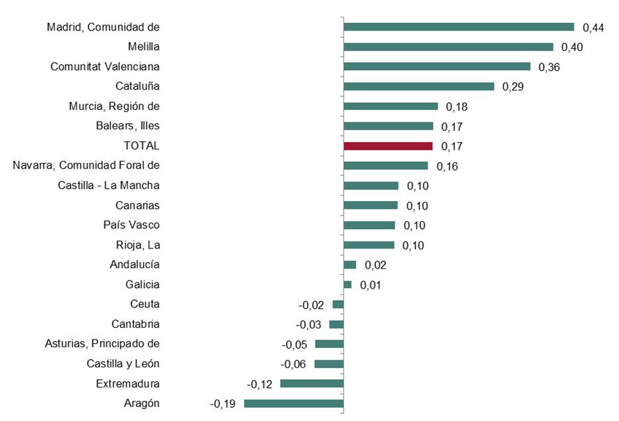 Por debajo de la media del 0,17% se sitúan Navarra (0,16%), Castilla-La Mancha, Canarias, País Vasco y La Rioja con el 0,10%, Andalucía (0,02) y Galicia (0,01%). En negativo se encuentran Ceuta (0,02%), Galicia (0,01%), Cantabria(-0,03%), Astuiras (-0,05%), Castilla y León (-0,06%), Extremadura (0,12%) y Aragón (-0,19%).