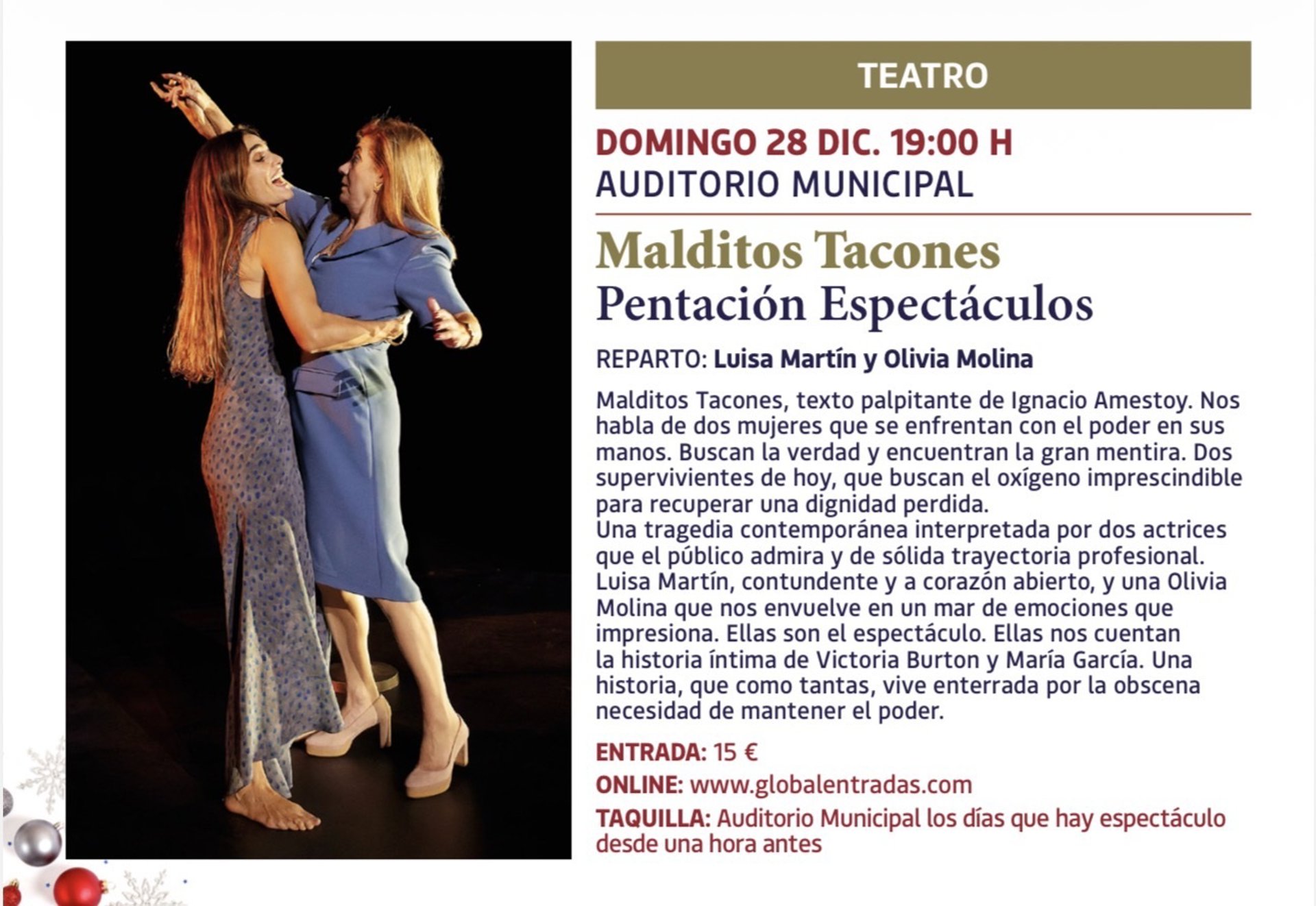 A las 19.00 horas, el Auditorio Municipal acogerá la representación de la obra teatral 'Malditos Tacones', producida por Pentación Espectáculos y protagonizada por Luisa Martín y Olivia Molina.